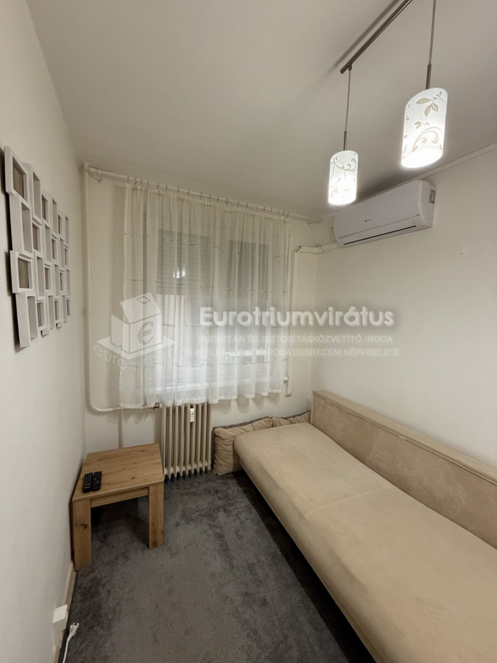 Debrecenben, Vénkertben, Sinai Miklós utcán, a Malompark közelében, 2-es villamos vonal mentén, 10 emeletes, liftes társasház, 2. emeletén, kiadó egy 55 nm – es, 1+ 2 szobás, bútorozott lakás, kisebbik szobája.