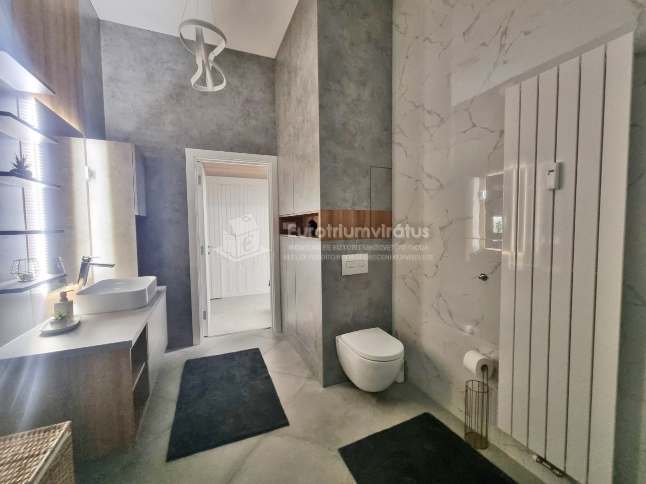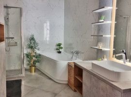 A fürdőszoba tágas, világos, burkolata márvány hatású.