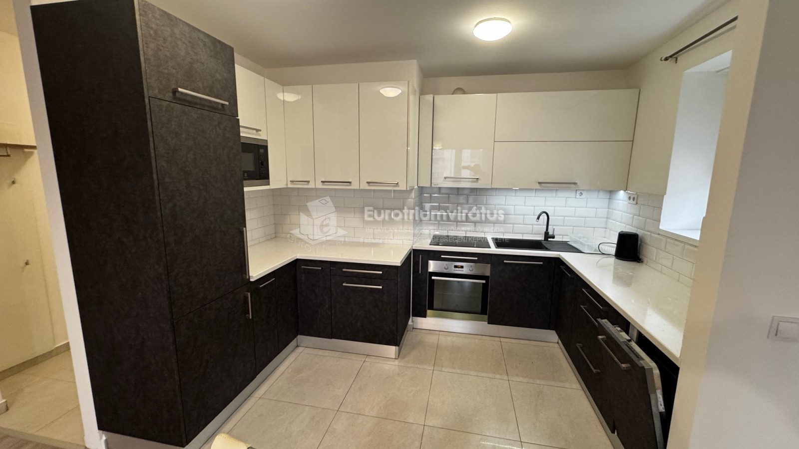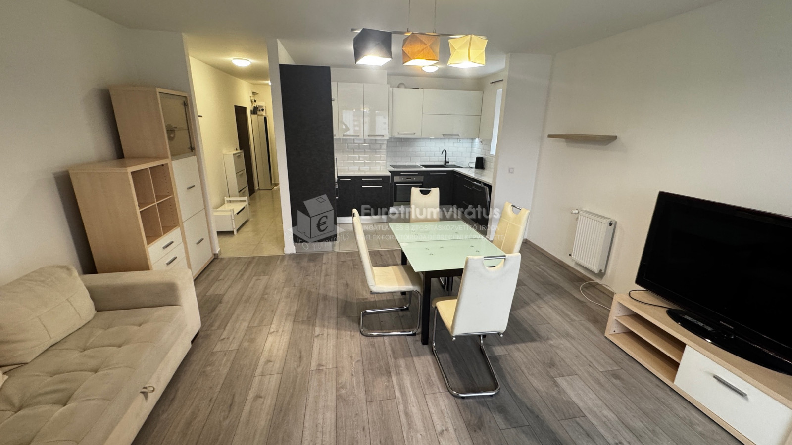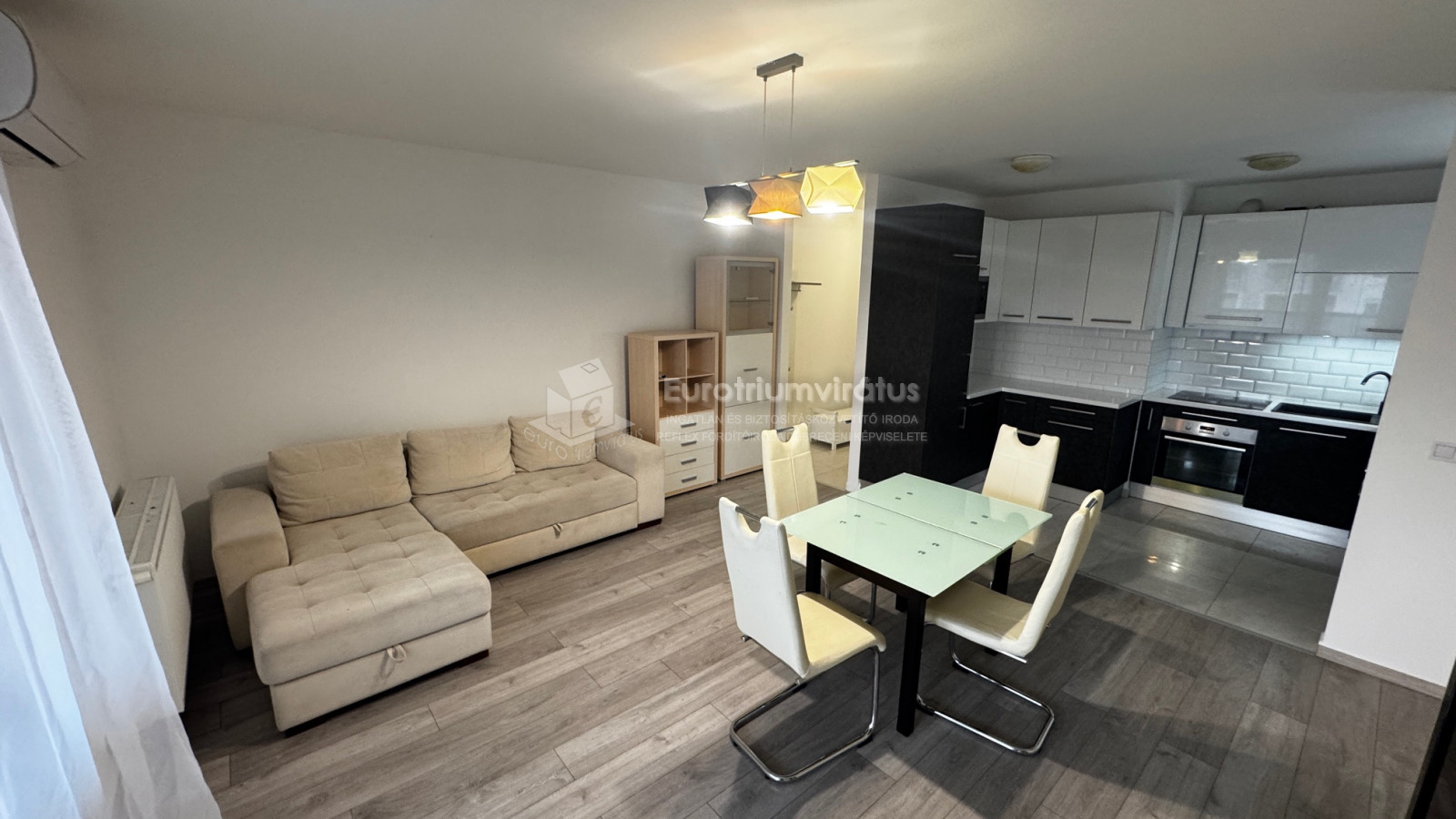 A beépített gépesített konyha és a nappali egy légtérben található.