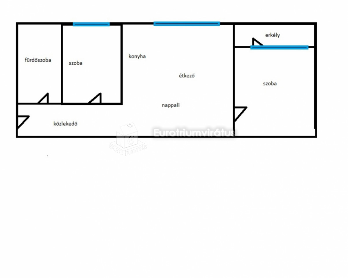 Felosztása: Nappali-étkező-konyha egy légtérben, 1 db nagy szoba erkéllyel és