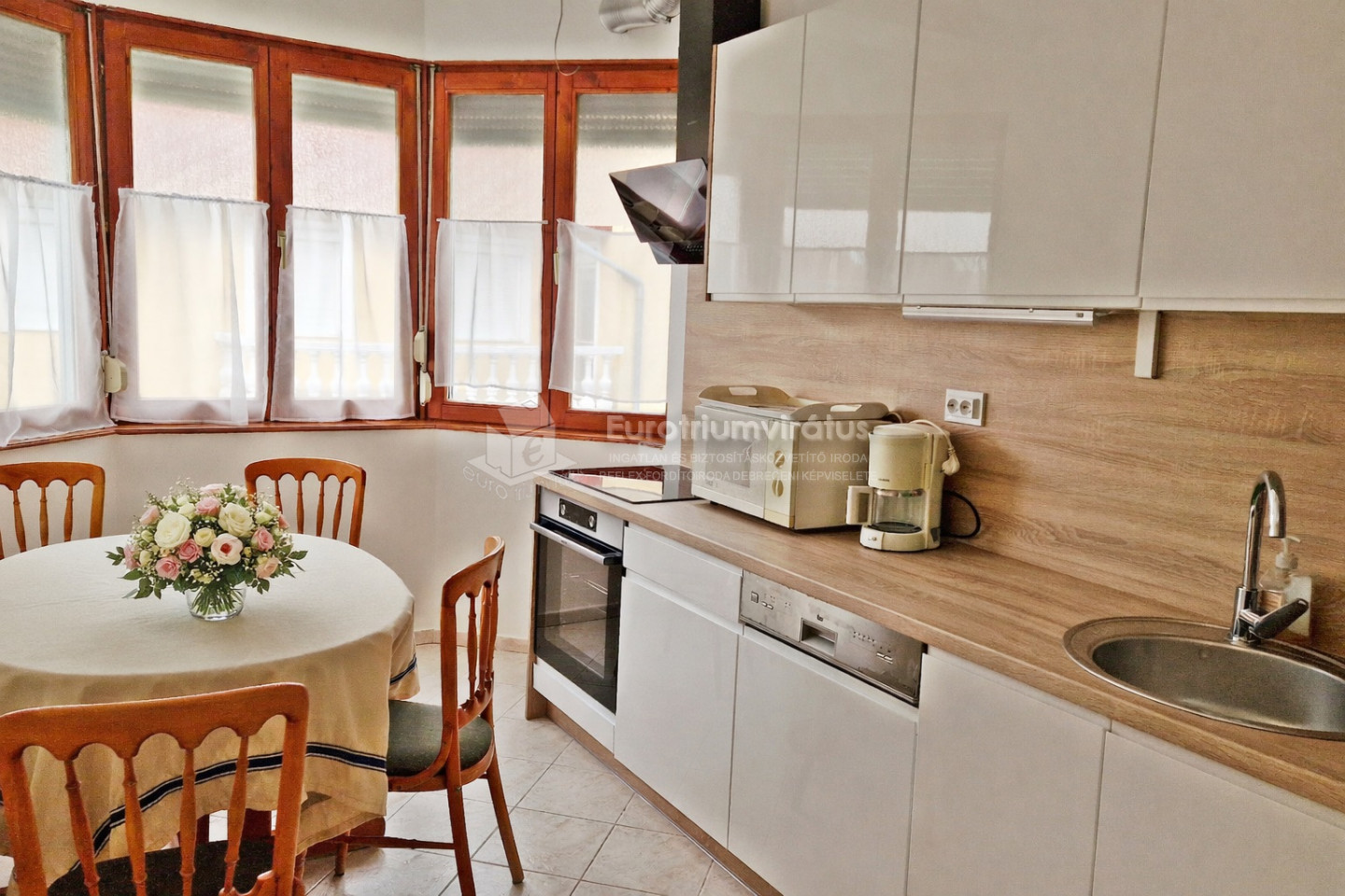 A konyhában új kerámiafőzőlapos tűzhely, elektromos sütő és hűtő,