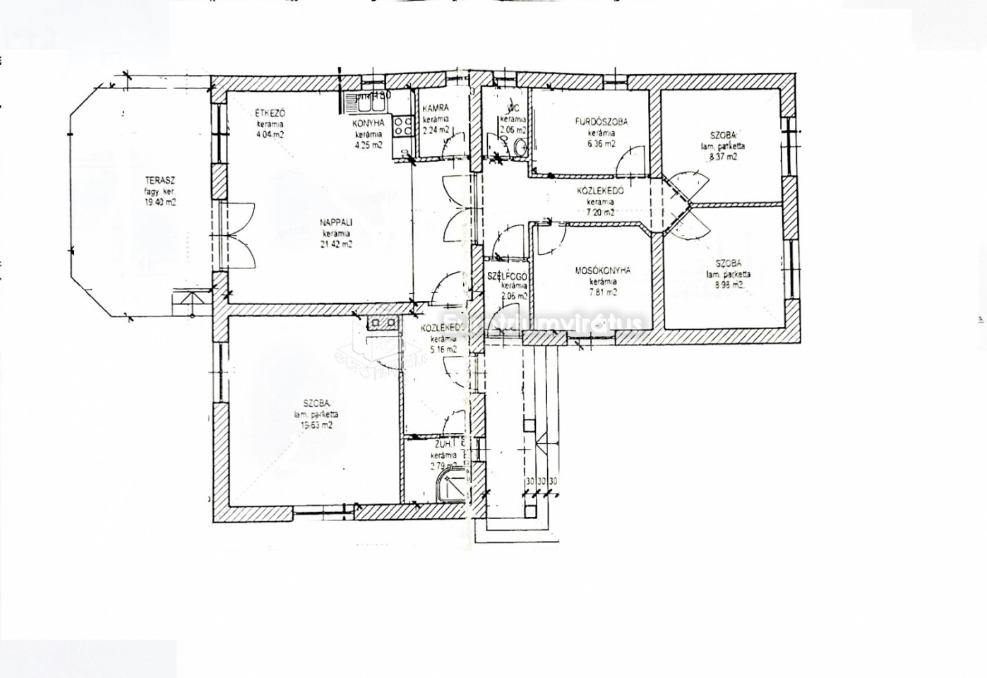 - Második lakrész: nappali + 3 szoba, fürdőszoba, külön WC, tároló