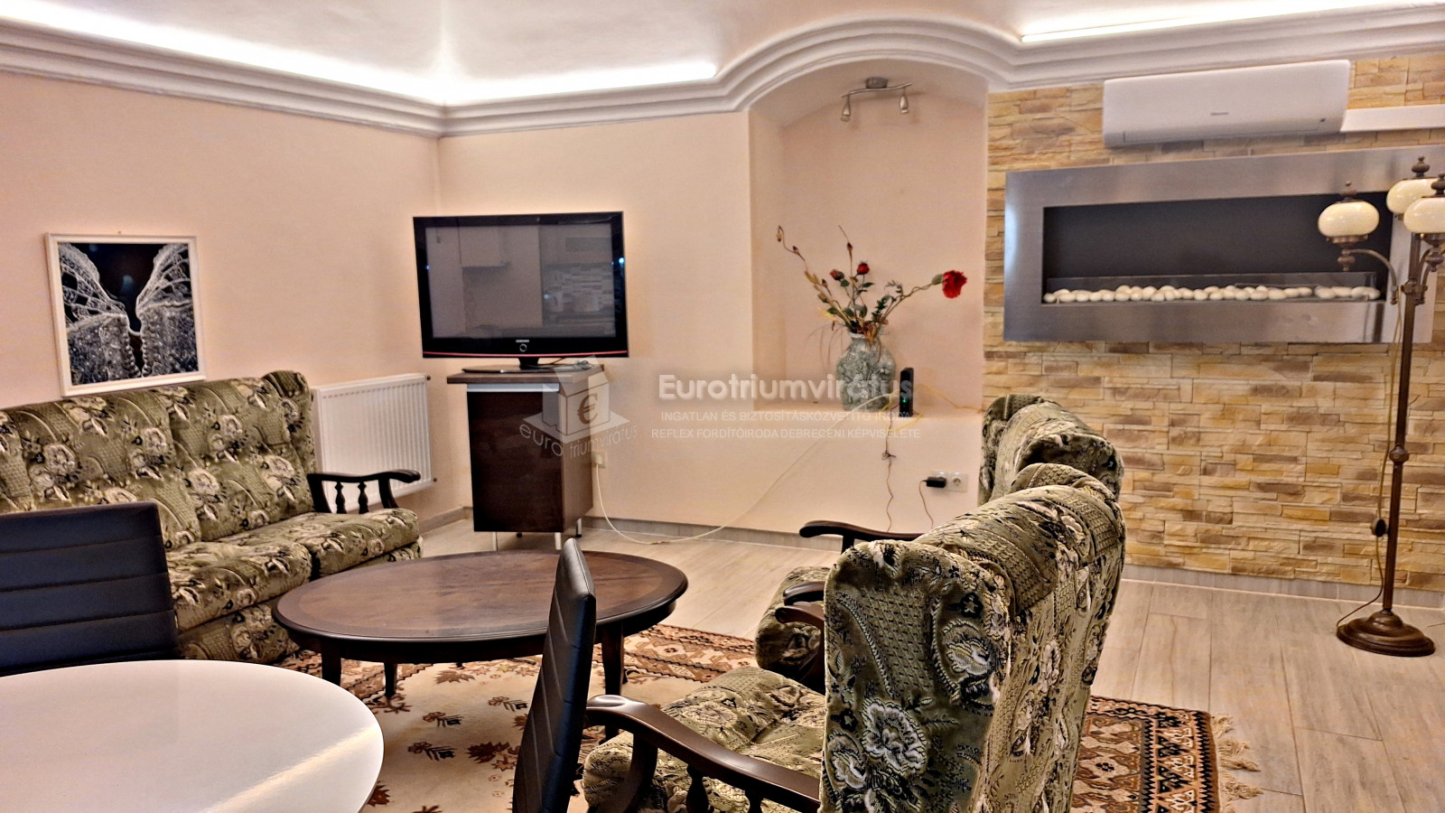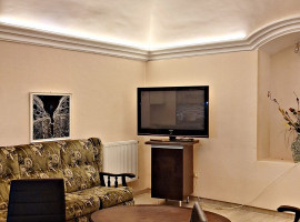 A nappali különlegessége az íves mennyezet, eredeti stukkókkal.