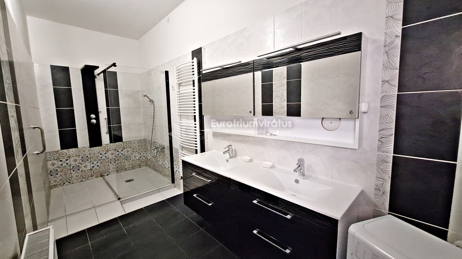 A nagy méretű fürdőszoba és a WC külön helyiségbe található.