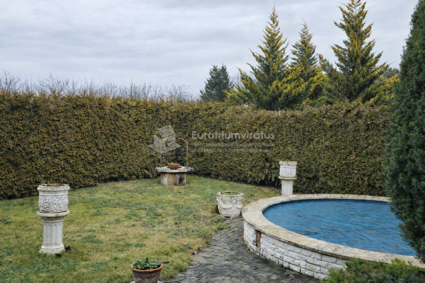 Udvar: csempézett terasz, fúrt kút, szalonnasütő, medence, automata öntözőrendszer.
