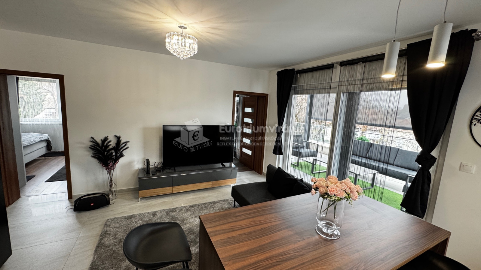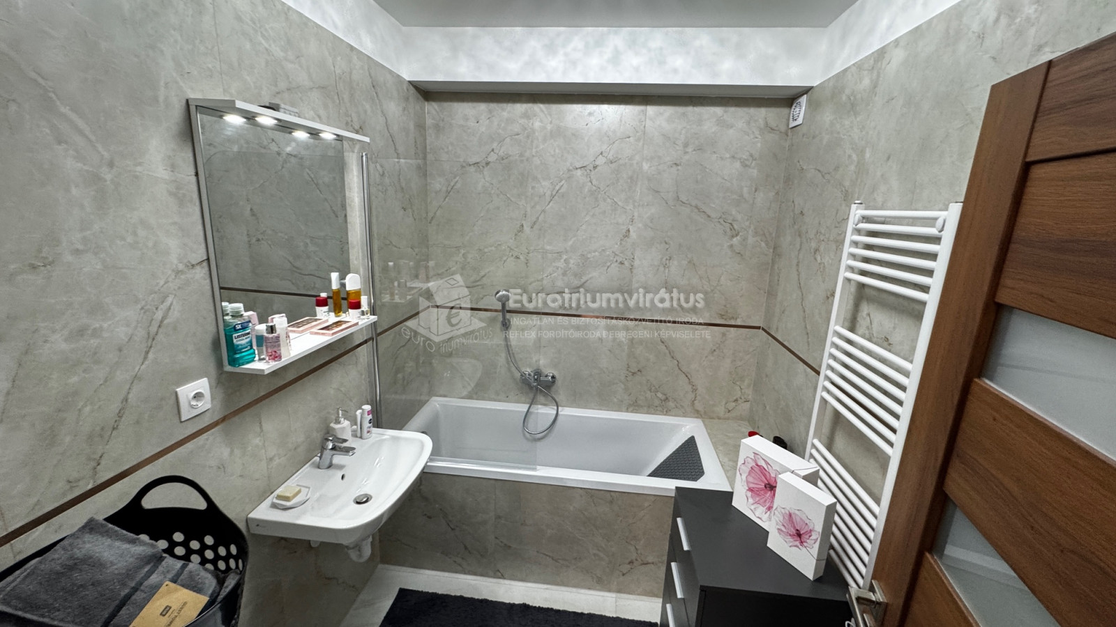A modern konyha beépített gépekkel ellátott, a burkolatok és szaniterek magas minőséget képviselnek. Teljes bútorzattal kiadó a lakásban padlófűtés, mennyezet hűtés-fűtés található.